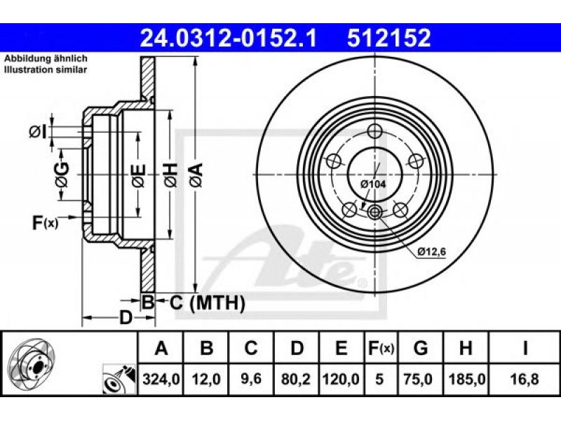 skersmuo [mm]: 324 stabdžių disko storis [mm]: 12 minimalus storis [mm]: 9,6 stabdžių disko tipas: visiškai angų skaičius: 5 užbaigimas: pastiprinta anglis paviršius: padengta aukštis [mm]: 80,2 centravimo skersmuo [mm]: 75 vidinis skersmuo [mm]: 185 angos apskritimo skersmuo [mm]: 120 angos Ø [mm]: 16,8 galimas MAPP kodas: nuo gamybos metų: 10/2003 montavimo vieta: galinė ašis |