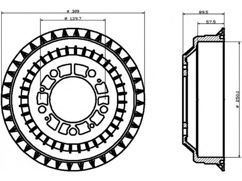 būgno skersmuo: 250,0 vidinis stabdžių būgno aukštis [mm]: 57,5 išorinis stabdžių būgno skersmuo [mm]: 309 bendras stabdžių būgno aukštis [mm]: 89,5 angų išdėstymas / skaičius: 05/09 angos apskritimo skersmuo [mm]: 139,7 maks. būgno nusidėv. matavimas [mm]: 251,5 svoris [kg]: 7,6 papildomas gaminys / papildoma informacija 2: be rato tvirtinimo smeigių |