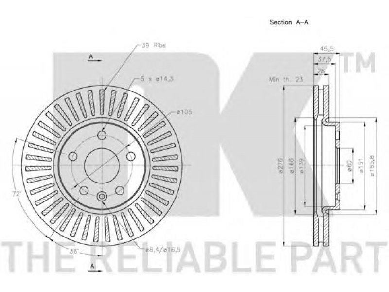 skersmuo [mm]: 276 aukštis [mm]: 45,5 svoris [kg]: 6,91 stabdžių disko tipas: ventiliuojama stabdžių disko storis [mm]: 26 minimalus storis [mm]: 23 centravimo skersmuo [mm]: 60 žiedų angų skaičius: 5 montavimo vieta: priekinė ašis