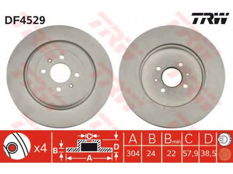 aukštis [mm]: 38,5 centravimo skersmuo [mm]: 57,9 minimalus storis [mm]: 22 stabdžių disko storis [mm]: 24 sriegio dydis: 12,7 skersmuo [mm]: 304 angos apskritimo skersmuo [mm]: 95 angų skaičius: 4 stabdžių disko tipas: ventiliuojama spalva: juoda paviršius: nudažyta |
