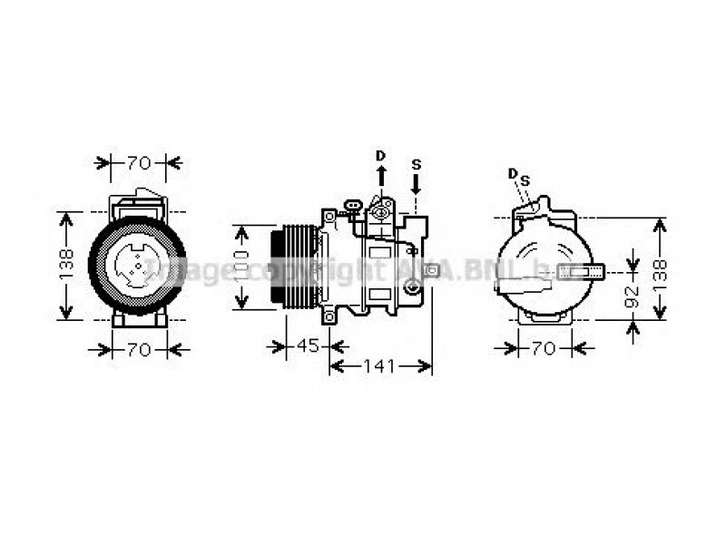 skriemuliai: su V formos rumbuoto diržo skriemuliu kompresoriaus ID: 7SEU17C sankabos ID: PV6 diržo skriemulio Ø [mm]: 100 įleidimo angos Ø [mm]: 28,4 išleidimo angos Ø [mm]: 13 |