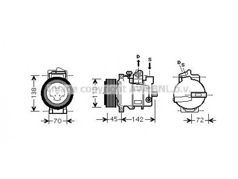 gamintojo apribojimas: DENSO skriemuliai: su V formos rumbuoto diržo skriemuliu kompresoriaus ID: 7SEU17C sankabos ID: PV6 aušinimo medžiaga: R 134a diržo skriemulio Ø [mm]: 110 įleidimo angos Ø [mm]: 28,4 išleidimo angos Ø [mm]: 13 |