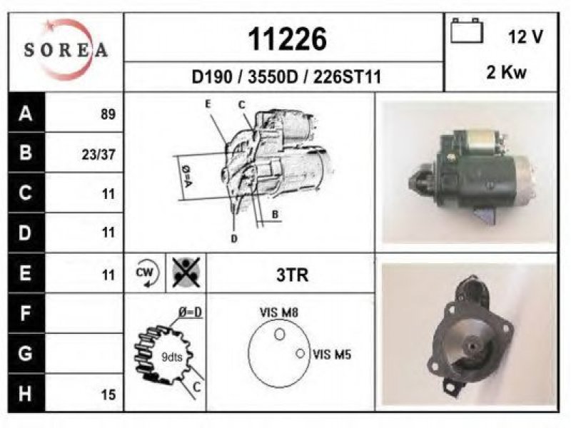 įtampa [V]: 12 nustatyta galia [kW]: 2 sukimo kryptis: rotacija pagal laikrodžio rodyklę krumplių skaičius: 9 techninės informacijos numeris: C007 centravimo skersmuo [mm]: 89 montavimo angų skaičius: 3 |