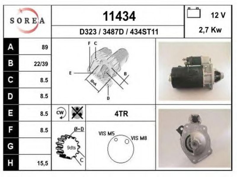 įtampa [V]: 12 nustatyta galia [kW]: 2,7 sukimo kryptis: rotacija pagal laikrodžio rodyklę krumplių skaičius: 9 techninės informacijos numeris: C056 centravimo skersmuo [mm]: 89 montavimo angų skaičius: 4 |