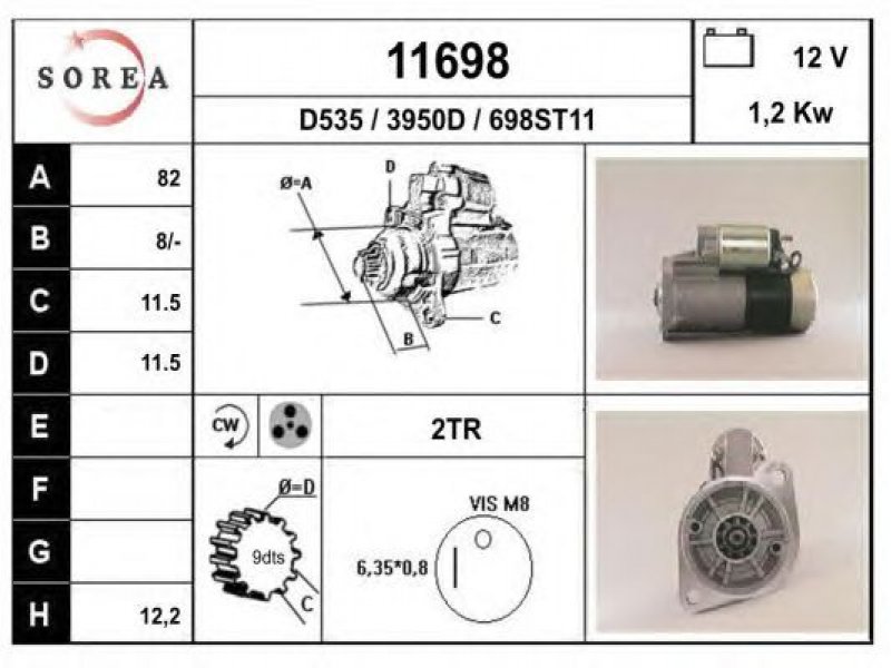 įtampa [V]: 12 nustatyta galia [kW]: 1,2 sukimo kryptis: rotacija pagal laikrodžio rodyklę krumplių skaičius: 9 techninės informacijos numeris: C002 centravimo skersmuo [mm]: 82 montavimo angų skaičius: 2 |