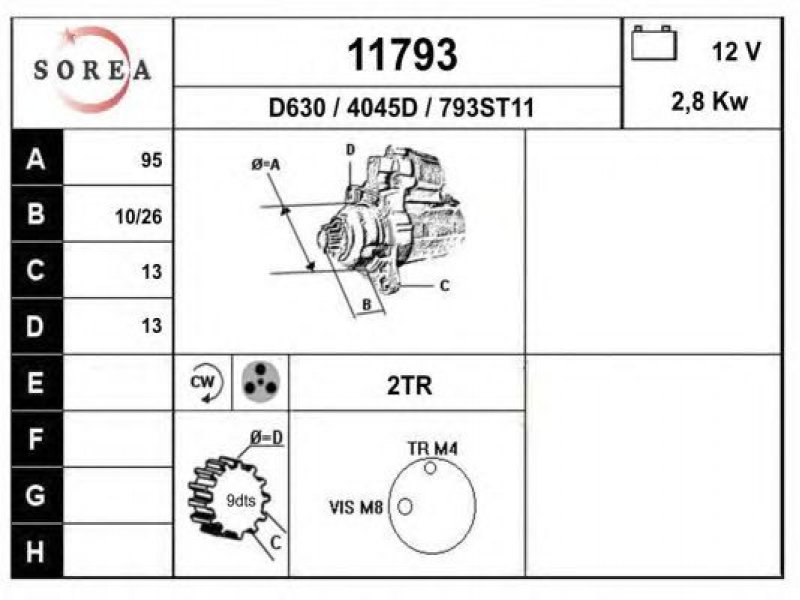 įtampa [V]: 12 nustatyta galia [kW]: 2,8 sukimo kryptis: rotacija pagal laikrodžio rodyklę krumplių skaičius: 9 techninės informacijos numeris: C080 centravimo skersmuo [mm]: 95 montavimo angų skaičius: 2 |