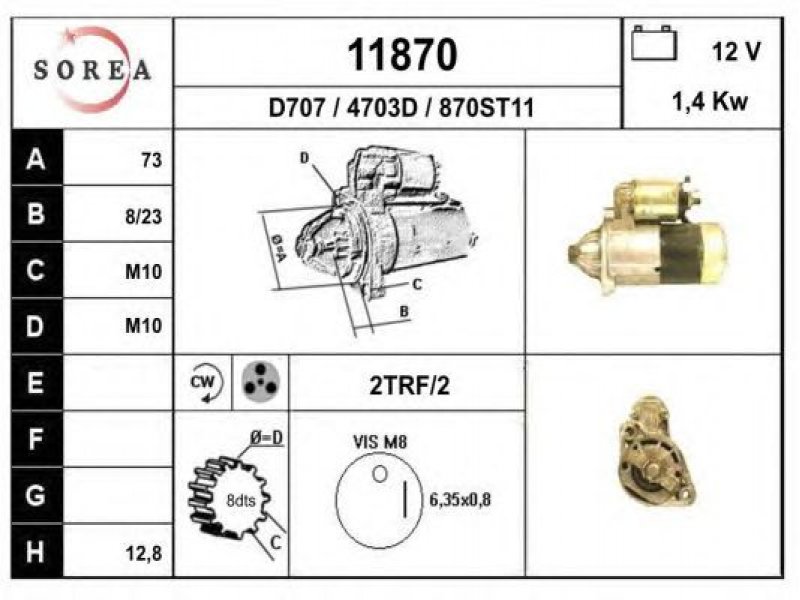 įtampa [V]: 12 nustatyta galia [kW]: 1,4 sukimo kryptis: rotacija pagal laikrodžio rodyklę krumplių skaičius: 8 techninės informacijos numeris: C001 centravimo skersmuo [mm]: 73 montavimo angų skaičius: 2 srieginių angų skaičius: 2 |