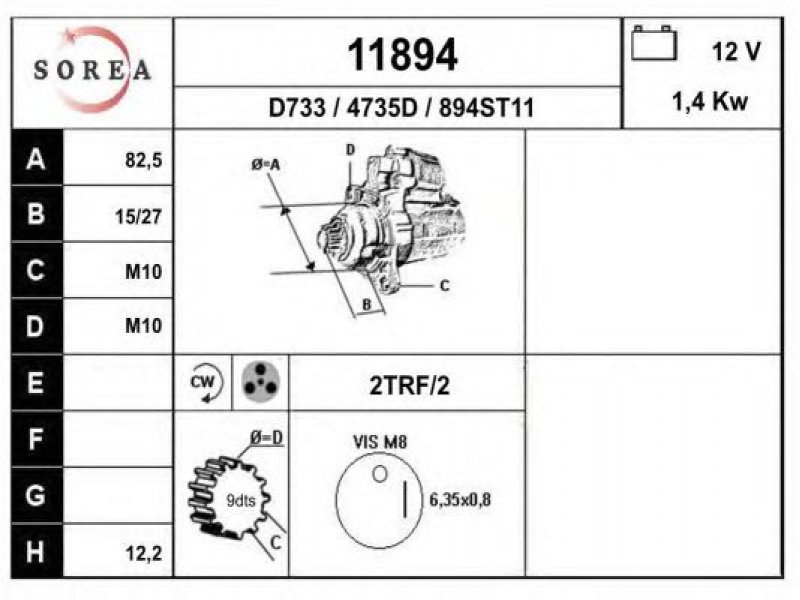 įtampa [V]: 12 nustatyta galia [kW]: 1,4 sukimo kryptis: rotacija pagal laikrodžio rodyklę krumplių skaičius: 9 techninės informacijos numeris: C001 centravimo skersmuo [mm]: 82,4 montavimo angų skaičius: 2 srieginių angų skaičius: 2 |