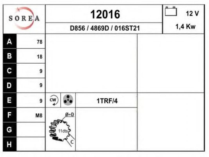 įtampa [V]: 12 nustatyta galia [kW]: 1,4 sukimo kryptis: rotacija pagal laikrodžio rodyklę krumplių skaičius: 11 centravimo skersmuo [mm]: 78 montavimo angų skaičius: 4 srieginių angų skaičius: 1 |