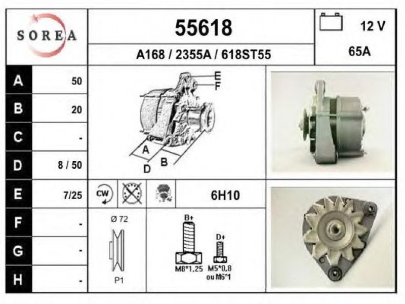 įtampa [V]: 12 kintamosios srovės generatoriaus įkrovimo srovė [A]: 65 sukimo kryptis: rotacija pagal laikrodžio rodyklę papildomas gaminys / papildoma informacija: su integruotu reguliatoriumi techninės informacijos numeris: C04 terminalas / spaustukas: be apsūkų matuoklio jungties briaunų skaičius: 1 skriemuliai: su diržo skriemuliu skersmuo [mm]: 72 |