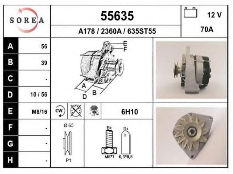 įtampa [V]: 12 kintamosios srovės generatoriaus įkrovimo srovė [A]: 70 sukimo kryptis: rotacija pagal laikrodžio rodyklę papildomas gaminys / papildoma informacija: su integruotu reguliatoriumi techninės informacijos numeris: C03 terminalas / spaustukas: be apsūkų matuoklio jungties briaunų skaičius: 1 skriemuliai: su diržo skriemuliu skersmuo [mm]: 65 |