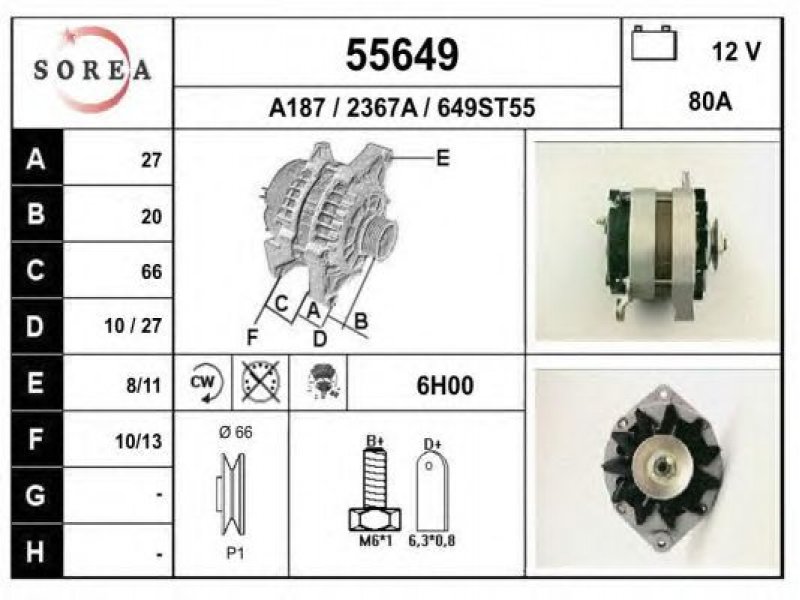 įtampa [V]: 12 kintamosios srovės generatoriaus įkrovimo srovė [A]: 80 sukimo kryptis: rotacija pagal laikrodžio rodyklę papildomas gaminys / papildoma informacija: su integruotu reguliatoriumi techninės informacijos numeris: C03 terminalas / spaustukas: be apsūkų matuoklio jungties briaunų skaičius: 1 skriemuliai: su diržo skriemuliu skersmuo [mm]: 66 |