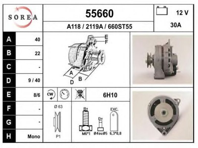įtampa [V]: 12 kintamosios srovės generatoriaus įkrovimo srovė [A]: 30 sukimo kryptis: rotacija pagal laikrodžio rodyklę techninės informacijos numeris: C02 terminalas / spaustukas: su sūkių skaitiklio mova briaunų skaičius: 1 skriemuliai: su diržo skriemuliu skersmuo [mm]: 63 |