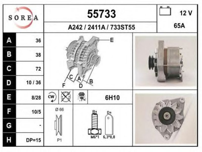 įtampa [V]: 12 kintamosios srovės generatoriaus įkrovimo srovė [A]: 65 sukimo kryptis: rotacija pagal laikrodžio rodyklę papildomas gaminys / papildoma informacija: su integruotu reguliatoriumi techninės informacijos numeris: C03 terminalas / spaustukas: be apsūkų matuoklio jungties briaunų skaičius: 1 skriemuliai: su diržo skriemuliu skersmuo [mm]: 66 |