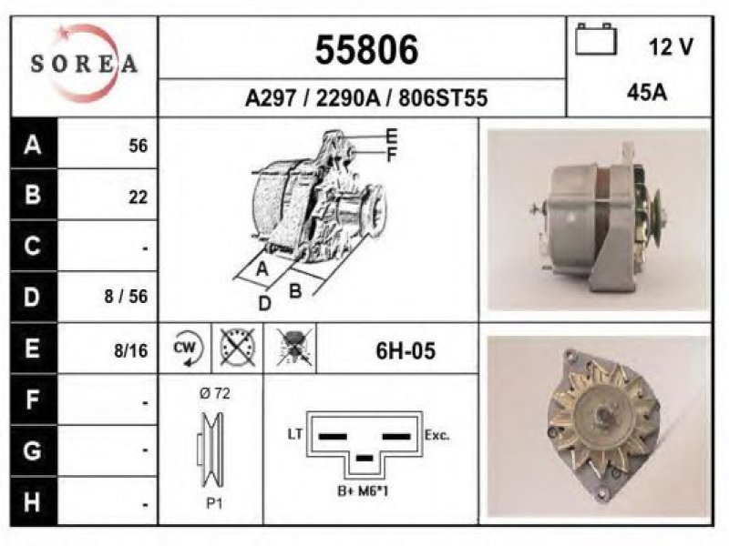 įtampa [V]: 12 kintamosios srovės generatoriaus įkrovimo srovė [A]: 45 sukimo kryptis: rotacija pagal laikrodžio rodyklę techninės informacijos numeris: C24 terminalas / spaustukas: be apsūkų matuoklio jungties briaunų skaičius: 1 skriemuliai: su diržo skriemuliu skersmuo [mm]: 72 |