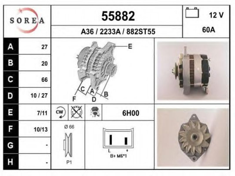 įtampa [V]: 12 kintamosios srovės generatoriaus įkrovimo srovė [A]: 60 sukimo kryptis: rotacija pagal laikrodžio rodyklę papildomas gaminys / papildoma informacija: su integruotu reguliatoriumi techninės informacijos numeris: C32 terminalas / spaustukas: be apsūkų matuoklio jungties briaunų skaičius: 1 skriemuliai: su diržo skriemuliu skersmuo [mm]: 66 |