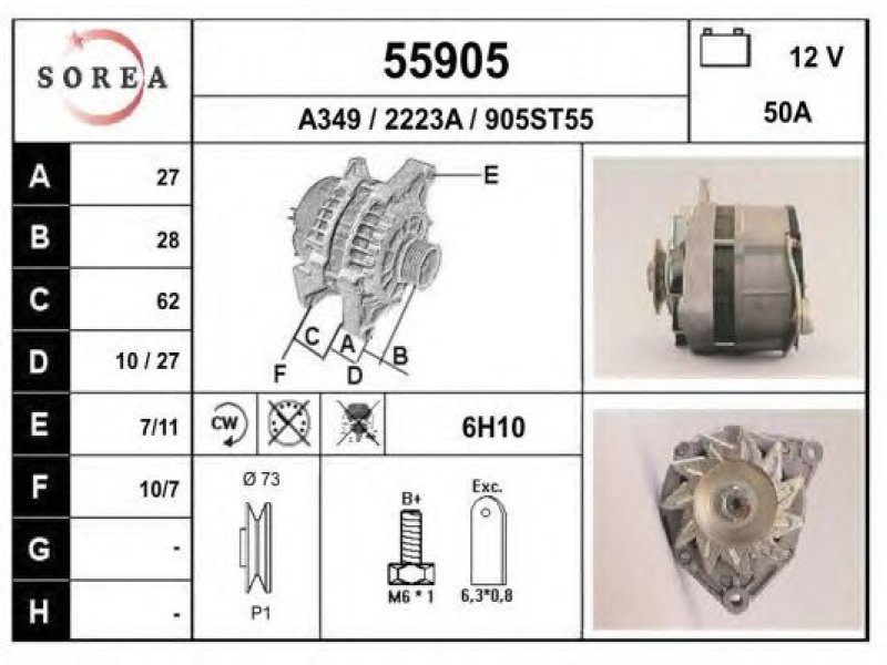 įtampa [V]: 12 kintamosios srovės generatoriaus įkrovimo srovė [A]: 50 sukimo kryptis: rotacija pagal laikrodžio rodyklę techninės informacijos numeris: C08 terminalas / spaustukas: be apsūkų matuoklio jungties briaunų skaičius: 1 skriemuliai: su diržo skriemuliu skersmuo [mm]: 73 |