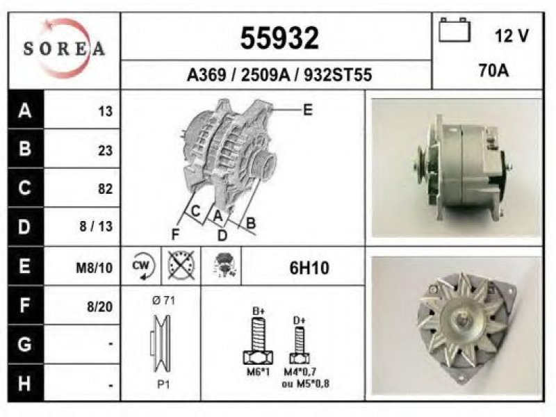 įtampa [V]: 12 kintamosios srovės generatoriaus įkrovimo srovė [A]: 70 sukimo kryptis: rotacija pagal laikrodžio rodyklę papildomas gaminys / papildoma informacija: su integruotu reguliatoriumi techninės informacijos numeris: C11 terminalas / spaustukas: be apsūkų matuoklio jungties briaunų skaičius: 1 skriemuliai: su diržo skriemuliu skersmuo [mm]: 71 |