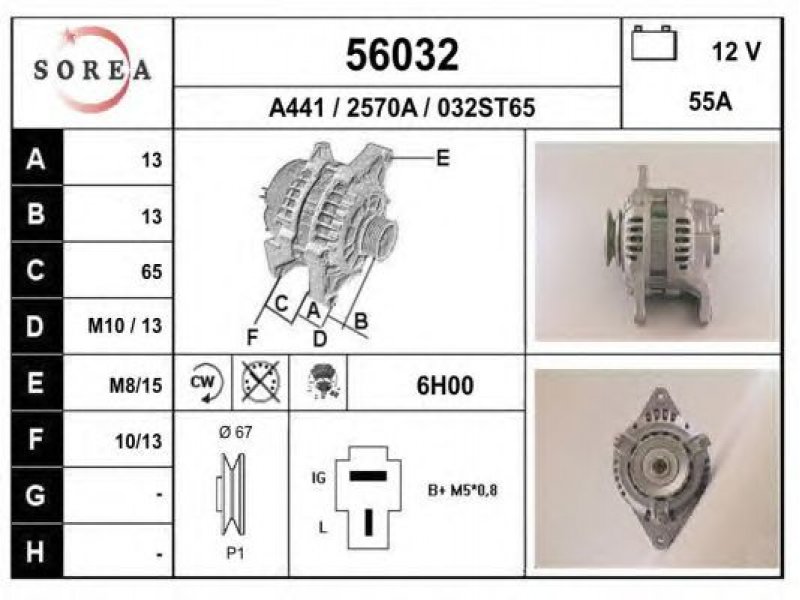 įtampa [V]: 12 kintamosios srovės generatoriaus įkrovimo srovė [A]: 55 sukimo kryptis: rotacija pagal laikrodžio rodyklę papildomas gaminys / papildoma informacija: su integruotu reguliatoriumi techninės informacijos numeris: C18 terminalas / spaustukas: be apsūkų matuoklio jungties briaunų skaičius: 1 skriemuliai: su diržo skriemuliu skersmuo [mm]: 67 |