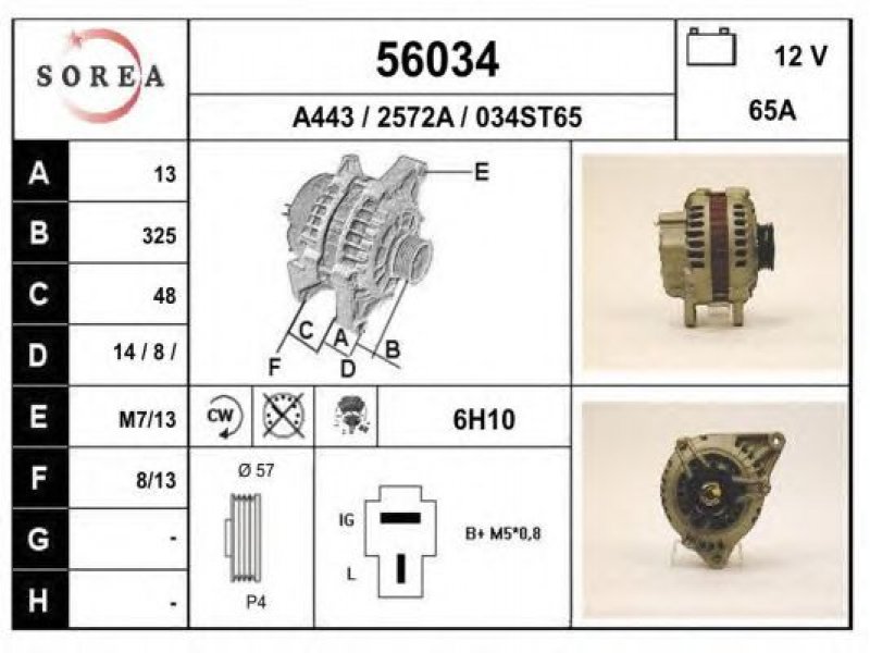 įtampa [V]: 12 kintamosios srovės generatoriaus įkrovimo srovė [A]: 65 sukimo kryptis: rotacija pagal laikrodžio rodyklę papildomas gaminys / papildoma informacija: su integruotu reguliatoriumi techninės informacijos numeris: C18 terminalas / spaustukas: be apsūkų matuoklio jungties briaunų skaičius: 4 skriemuliai: su diržo skriemuliu skersmuo [mm]: 57 |