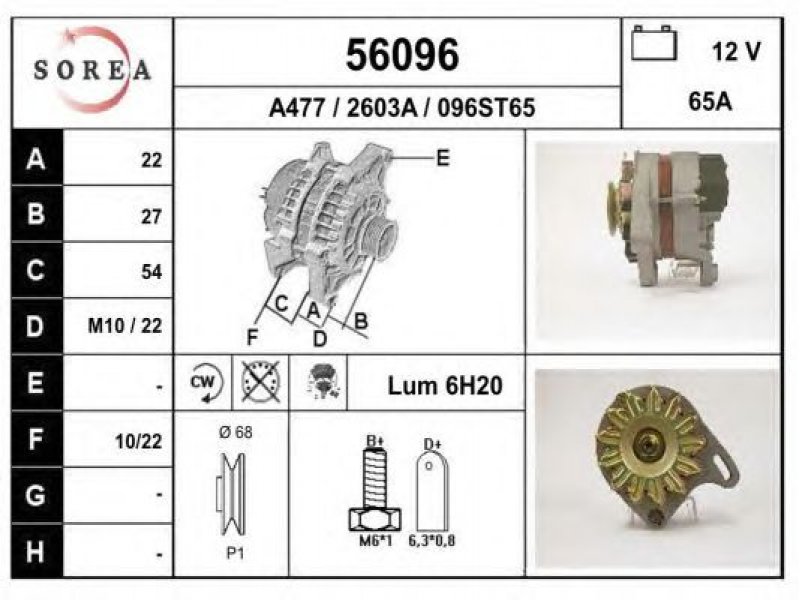 įtampa [V]: 12 kintamosios srovės generatoriaus įkrovimo srovė [A]: 65 sukimo kryptis: rotacija pagal laikrodžio rodyklę papildomas gaminys / papildoma informacija: su integruotu reguliatoriumi techninės informacijos numeris: C03 terminalas / spaustukas: be apsūkų matuoklio jungties briaunų skaičius: 1 skriemuliai: su diržo skriemuliu skersmuo [mm]: 68 |