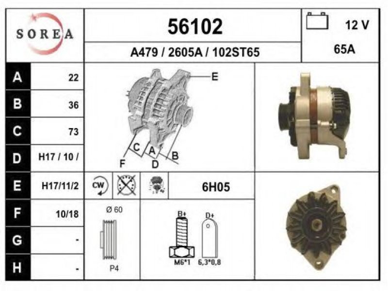 įtampa [V]: 12 kintamosios srovės generatoriaus įkrovimo srovė [A]: 65 sukimo kryptis: rotacija pagal laikrodžio rodyklę papildomas gaminys / papildoma informacija: su integruotu reguliatoriumi techninės informacijos numeris: C03 terminalas / spaustukas: be apsūkų matuoklio jungties briaunų skaičius: 4 skriemuliai: su diržo skriemuliu skersmuo [mm]: 60 |
