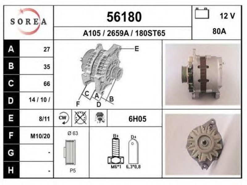 įtampa [V]: 12 kintamosios srovės generatoriaus įkrovimo srovė [A]: 80 sukimo kryptis: rotacija pagal laikrodžio rodyklę papildomas gaminys / papildoma informacija: su integruotu reguliatoriumi techninės informacijos numeris: C03 terminalas / spaustukas: be apsūkų matuoklio jungties briaunų skaičius: 5 skriemuliai: su diržo skriemuliu skersmuo [mm]: 63 |