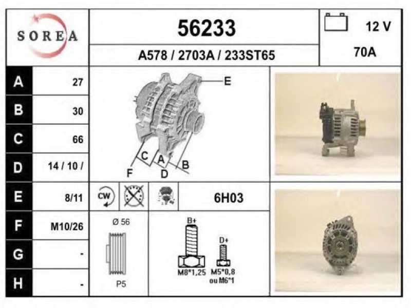įtampa [V]: 12 kintamosios srovės generatoriaus įkrovimo srovė [A]: 70 sukimo kryptis: rotacija pagal laikrodžio rodyklę papildomas gaminys / papildoma informacija: su integruotu reguliatoriumi techninės informacijos numeris: C04 terminalas / spaustukas: be apsūkų matuoklio jungties briaunų skaičius: 5 skriemuliai: su diržo skriemuliu skersmuo [mm]: 56 |