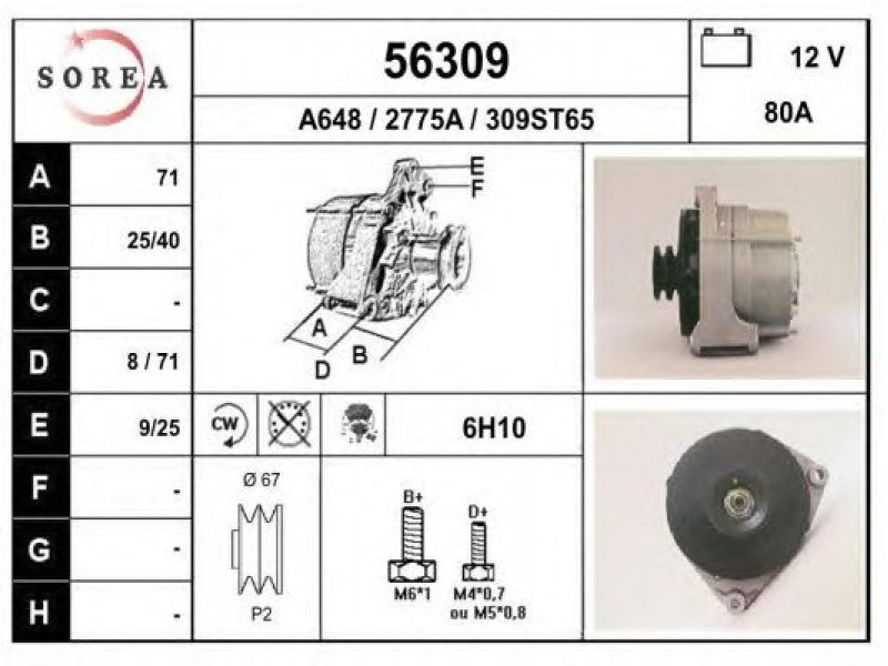 įtampa [V]: 12 kintamosios srovės generatoriaus įkrovimo srovė [A]: 80 sukimo kryptis: rotacija pagal laikrodžio rodyklę papildomas gaminys / papildoma informacija: su integruotu reguliatoriumi techninės informacijos numeris: C11 terminalas / spaustukas: be apsūkų matuoklio jungties briaunų skaičius: 2 skriemuliai: su dvigubu skriemuliu skersmuo [mm]: 67 |