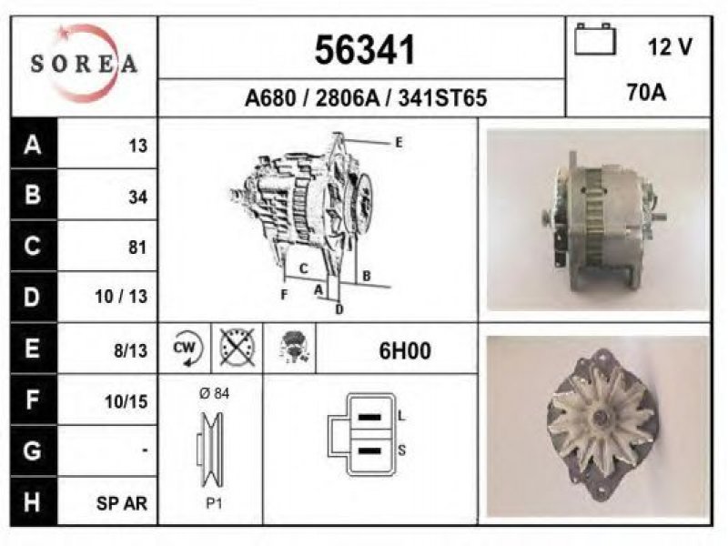 įtampa [V]: 12 kintamosios srovės generatoriaus įkrovimo srovė [A]: 70 sukimo kryptis: rotacija pagal laikrodžio rodyklę papildomas gaminys / papildoma informacija: su integruotu reguliatoriumi techninės informacijos numeris: C20 terminalas / spaustukas: be apsūkų matuoklio jungties briaunų skaičius: 1 skriemuliai: su diržo skriemuliu skersmuo [mm]: 84 |