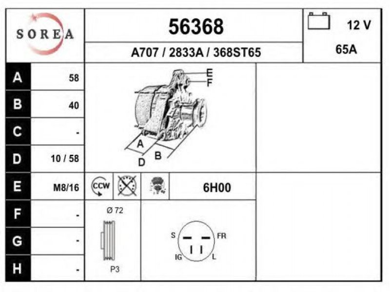 įtampa [V]: 12 kintamosios srovės generatoriaus įkrovimo srovė [A]: 65 sukimo kryptis: Rotacija prieš laikrodžio rodyklę papildomas gaminys / papildoma informacija: su integruotu reguliatoriumi techninės informacijos numeris: C47 terminalas / spaustukas: be apsūkų matuoklio jungties briaunų skaičius: 3 skriemuliai: su diržo skriemuliu skersmuo [mm]: 72 |