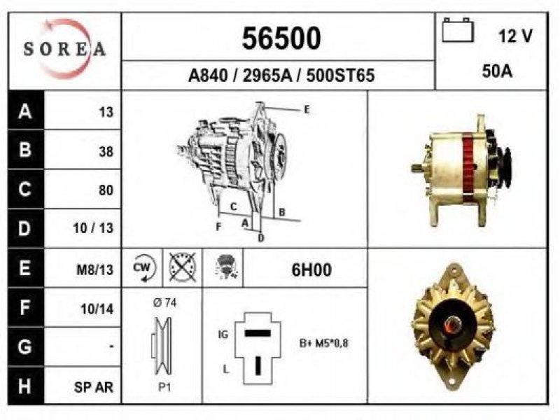 įtampa [V]: 12 kintamosios srovės generatoriaus įkrovimo srovė [A]: 50 sukimo kryptis: rotacija pagal laikrodžio rodyklę papildomas gaminys / papildoma informacija: su integruotu reguliatoriumi techninės informacijos numeris: C18 terminalas / spaustukas: be apsūkų matuoklio jungties briaunų skaičius: 1 skriemuliai: su diržo skriemuliu skersmuo [mm]: 74 |