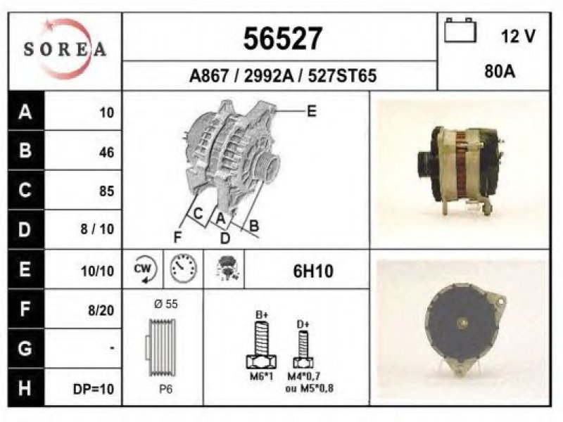įtampa [V]: 12 kintamosios srovės generatoriaus įkrovimo srovė [A]: 80 sukimo kryptis: rotacija pagal laikrodžio rodyklę papildomas gaminys / papildoma informacija: su integruotu reguliatoriumi techninės informacijos numeris: C11 terminalas / spaustukas: su sūkių skaitiklio mova briaunų skaičius: 6 skriemuliai: su diržo skriemuliu skersmuo [mm]: 55 |