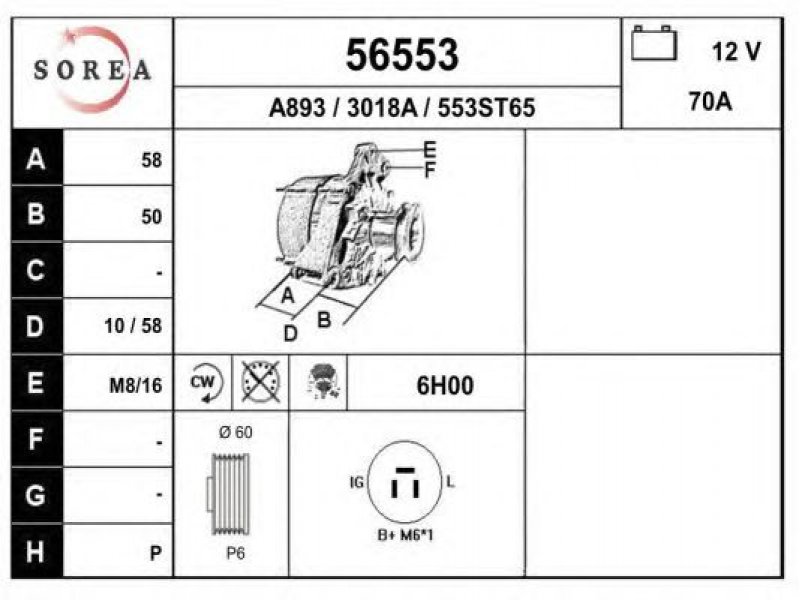 įtampa [V]: 12 kintamosios srovės generatoriaus įkrovimo srovė [A]: 70 sukimo kryptis: rotacija pagal laikrodžio rodyklę papildomas gaminys / papildoma informacija: su integruotu reguliatoriumi techninės informacijos numeris: C28 terminalas / spaustukas: be apsūkų matuoklio jungties briaunų skaičius: 6 skriemuliai: su diržo skriemuliu skersmuo [mm]: 60 |