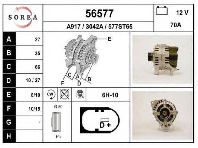 įtampa [V]: 12 kintamosios srovės generatoriaus įkrovimo srovė [A]: 70 sukimo kryptis: rotacija pagal laikrodžio rodyklę papildomas gaminys / papildoma informacija: su integruotu reguliatoriumi techninės informacijos numeris: C65 terminalas / spaustukas: be apsūkų matuoklio jungties briaunų skaičius: 5 skriemuliai: su diržo skriemuliu skersmuo [mm]: 50 |