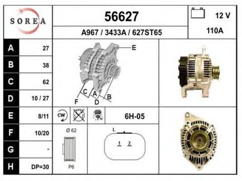 įtampa [V]: 12 kintamosios srovės generatoriaus įkrovimo srovė [A]: 110 sukimo kryptis: rotacija pagal laikrodžio rodyklę papildomas gaminys / papildoma informacija: su integruotu reguliatoriumi techninės informacijos numeris: C22 terminalas / spaustukas: be apsūkų matuoklio jungties briaunų skaičius: 6 skriemuliai: su diržo skriemuliu skersmuo [mm]: 62 |