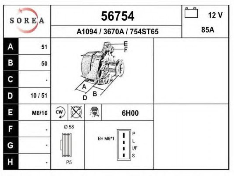 įtampa [V]: 12 kintamosios srovės generatoriaus įkrovimo srovė [A]: 85 sukimo kryptis: rotacija pagal laikrodžio rodyklę papildomas gaminys / papildoma informacija: su integruotu reguliatoriumi techninės informacijos numeris: C19 terminalas / spaustukas: be apsūkų matuoklio jungties briaunų skaičius: 5 skriemuliai: su diržo skriemuliu skersmuo [mm]: 58 |