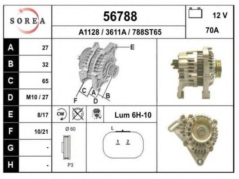įtampa [V]: 12 kintamosios srovės generatoriaus įkrovimo srovė [A]: 70 sukimo kryptis: rotacija pagal laikrodžio rodyklę papildomas gaminys / papildoma informacija: su integruotu reguliatoriumi techninės informacijos numeris: C22 terminalas / spaustukas: be apsūkų matuoklio jungties briaunų skaičius: 3 skriemuliai: su diržo skriemuliu skersmuo [mm]: 60 |