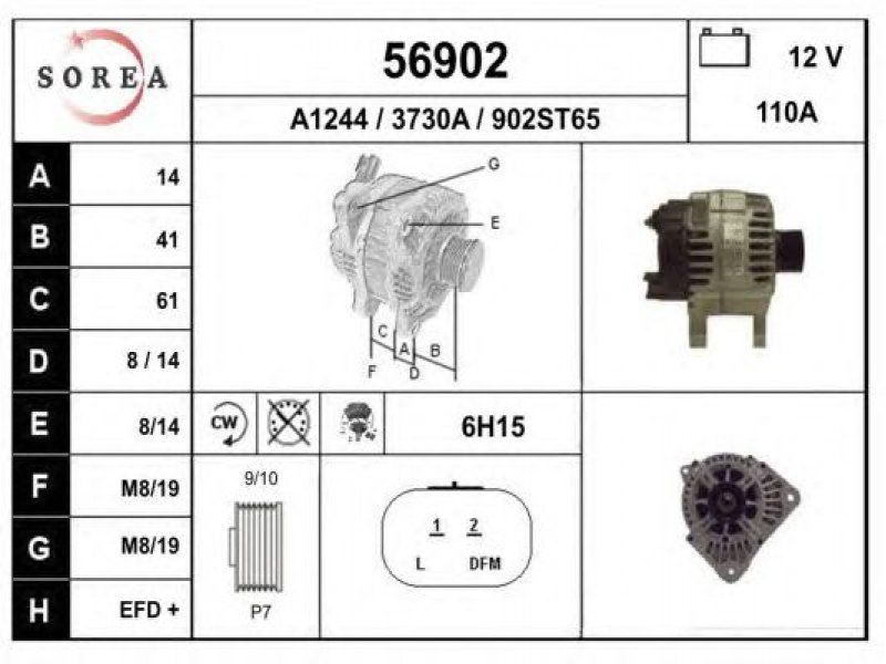 įtampa [V]: 12 kintamosios srovės generatoriaus įkrovimo srovė [A]: 110 sukimo kryptis: rotacija pagal laikrodžio rodyklę papildomas gaminys / papildoma informacija: su integruotu reguliatoriumi techninės informacijos numeris: C122 terminalas / spaustukas: be apsūkų matuoklio jungties briaunų skaičius: 7 skriemuliai: su diržo skriemuliu