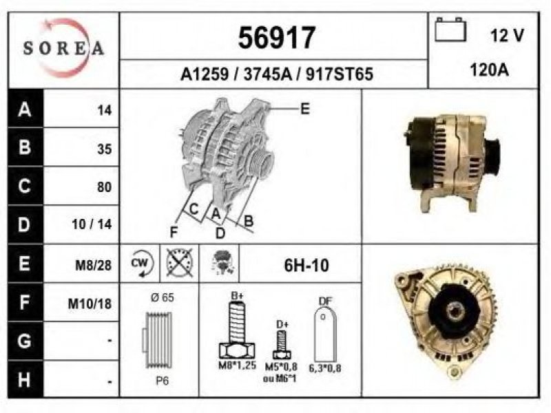 įtampa [V]: 12 kintamosios srovės generatoriaus įkrovimo srovė [A]: 120 sukimo kryptis: rotacija pagal laikrodžio rodyklę papildomas gaminys / papildoma informacija: su integruotu reguliatoriumi techninės informacijos numeris: C61 terminalas / spaustukas: be apsūkų matuoklio jungties briaunų skaičius: 6 skriemuliai: su diržo skriemuliu skersmuo [mm]: 65 |