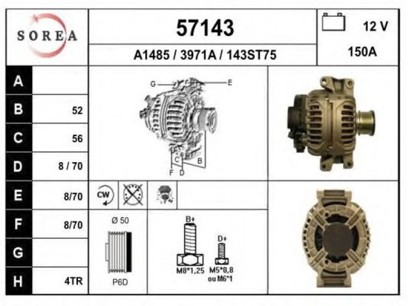 įtampa [V]: 12 kintamosios srovės generatoriaus įkrovimo srovė [A]: 150 sukimo kryptis: rotacija pagal laikrodžio rodyklę papildomas gaminys / papildoma informacija: su integruotu reguliatoriumi techninės informacijos numeris: C04 terminalas / spaustukas: be apsūkų matuoklio jungties briaunų skaičius: 6 skriemuliai: su laisvo eigos dirželio skriemuliu skersmuo [mm]: 50 |