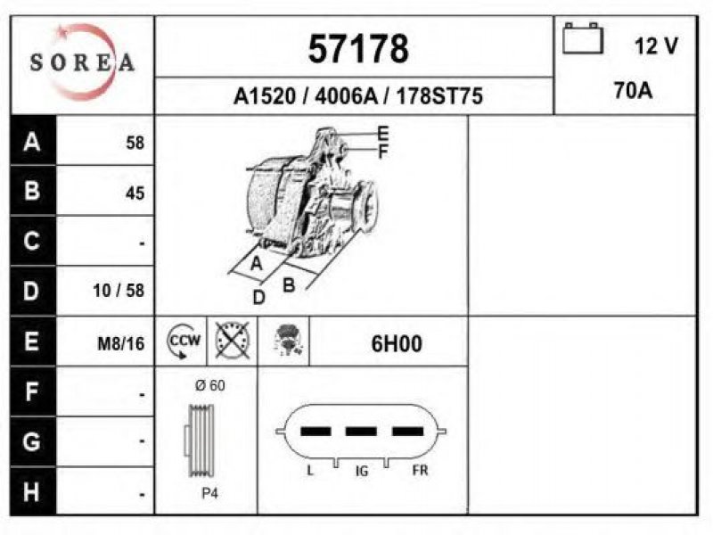 įtampa [V]: 12 kintamosios srovės generatoriaus įkrovimo srovė [A]: 70 sukimo kryptis: Rotacija prieš laikrodžio rodyklę papildomas gaminys / papildoma informacija: su integruotu reguliatoriumi techninės informacijos numeris: C92 terminalas / spaustukas: be apsūkų matuoklio jungties briaunų skaičius: 4 skriemuliai: su diržo skriemuliu skersmuo [mm]: 60 |