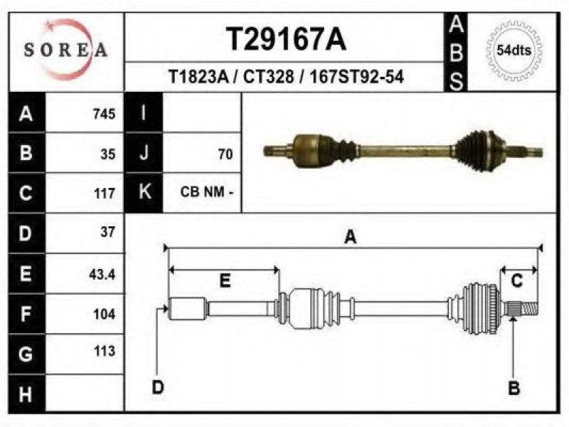 ilgis [mm]: 745 išorinis krumplys, rato pusė: 35 skersmuo 1 [mm]: 113 išorinis krumplys. kt. pusė: 37 skersmuo 2 [mm]: 104 krumplių skaičius, ABS žiedas: 54 stabdymas / važiavimo dinamika: transporto priemonėms su ABS kardaninis velenas: su ABS žiedu |