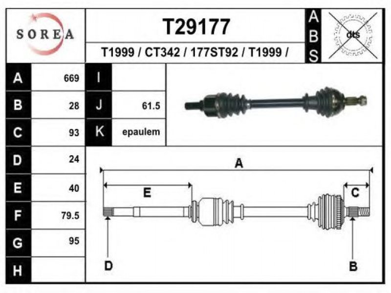 ilgis [mm]: 669 išorinis krumplys, rato pusė: 28 skersmuo 1 [mm]: 95 išorinis krumplys. kt. pusė: 24 skersmuo 2 [mm]: 79,5 stabdymas / važiavimo dinamika: transporto priemonėms su ABS kardaninis velenas: be ABS žiedo |