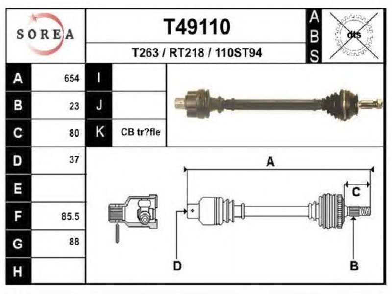ilgis [mm]: 654 išorinis krumplys, rato pusė: 23 skersmuo 1 [mm]: 88 išorinis krumplys. kt. pusė: 37 skersmuo 2 [mm]: 85,5 stabdymas / važiavimo dinamika: transporto priemonėms be ABS