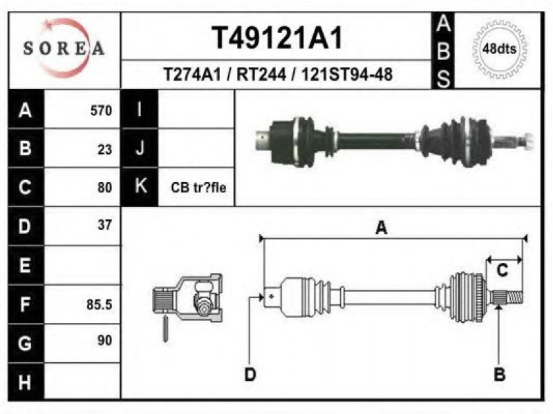 ilgis [mm]: 570 išorinis krumplys, rato pusė: 23 skersmuo 1 [mm]: 90 išorinis krumplys. kt. pusė: 37 skersmuo 2 [mm]: 85,5 krumplių skaičius, ABS žiedas: 48 stabdymas / važiavimo dinamika: transporto priemonėms su ABS kardaninis velenas: su ABS žiedu |