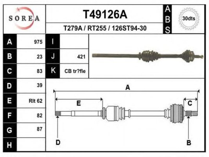 ilgis [mm]: 975 išorinis krumplys, rato pusė: 23 skersmuo 1 [mm]: 87 išorinis krumplys. kt. pusė: 39 skersmuo 2 [mm]: 82 krumplių skaičius, ABS žiedas: 30 stabdymas / važiavimo dinamika: transporto priemonėms su ABS kardaninis velenas: su ABS žiedu |