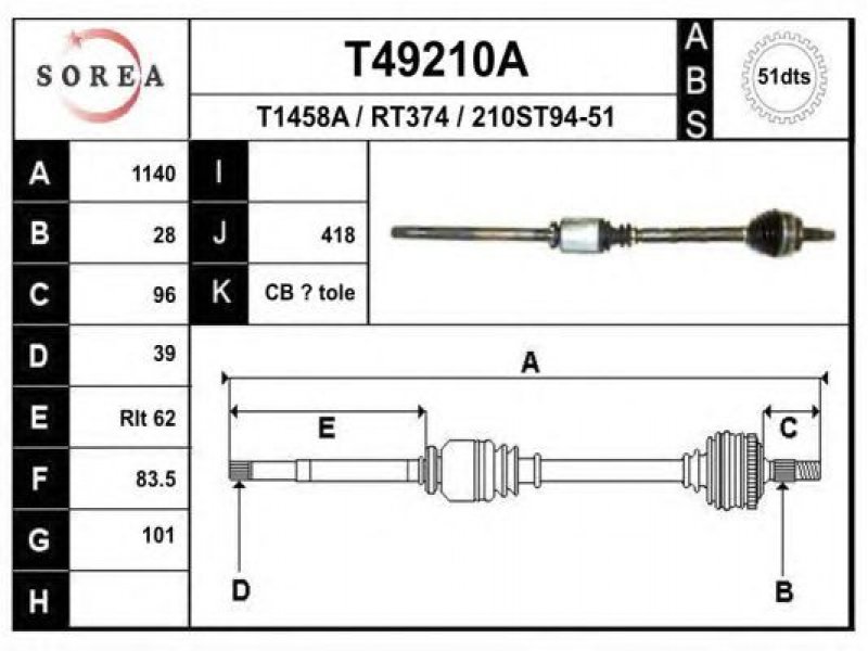 ilgis [mm]: 1140 išorinis krumplys, rato pusė: 28 skersmuo 1 [mm]: 101 išorinis krumplys. kt. pusė: 39 skersmuo 2 [mm]: 83,5 krumplių skaičius, ABS žiedas: 51 stabdymas / važiavimo dinamika: transporto priemonėms su ABS kardaninis velenas: su ABS žiedu |