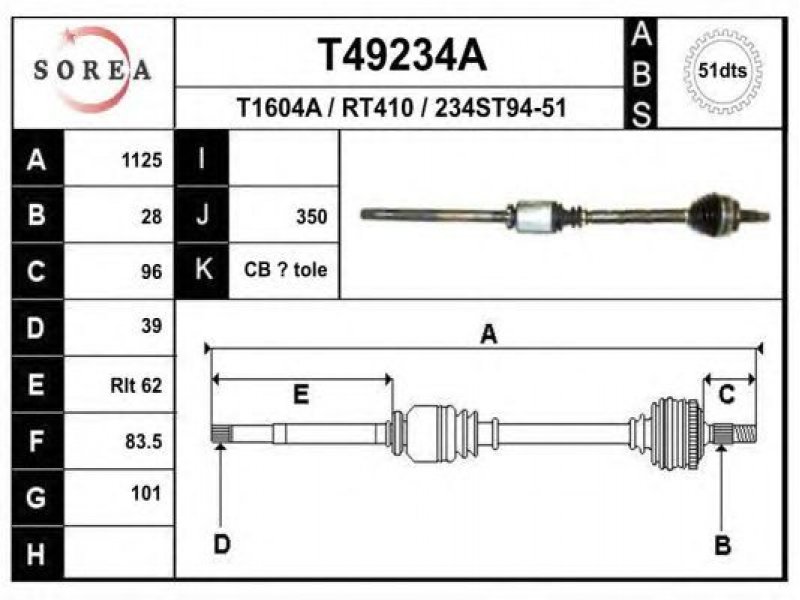 ilgis [mm]: 1125 išorinis krumplys, rato pusė: 28 skersmuo 1 [mm]: 101 išorinis krumplys. kt. pusė: 39 skersmuo 2 [mm]: 83,5 krumplių skaičius, ABS žiedas: 51 stabdymas / važiavimo dinamika: transporto priemonėms su ABS kardaninis velenas: su ABS žiedu |