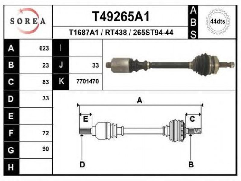 ilgis [mm]: 623 išorinis krumplys, rato pusė: 23 skersmuo 1 [mm]: 90 išorinis krumplys. kt. pusė: 33 skersmuo 2 [mm]: 72 krumplių skaičius, ABS žiedas: 44 stabdymas / važiavimo dinamika: transporto priemonėms su ABS kardaninis velenas: su ABS žiedu |